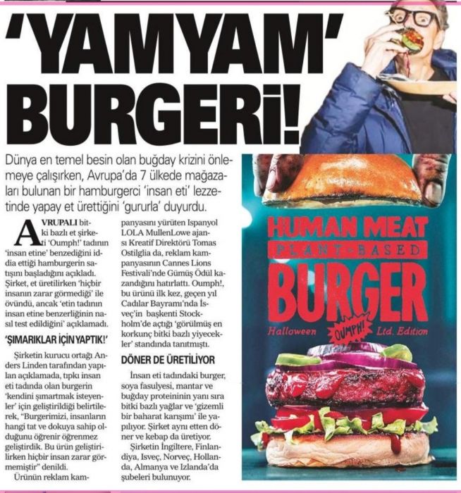 “İsveç merkezli bitki bazlı protein üreticisi Oumph, insan eti tadında bitki bazlı, vegan burger üretti. Şirket, burgerlerin üretiminin Cadılar Bayramı’ndan sonra durdurulduğunu bildirdi. İnsan eti fikri ürkütücü olsa da firma aslında bu hamleyle hayvanlardan yapılan ürünlerin kökenini sorgulatmayı amaçladı.”