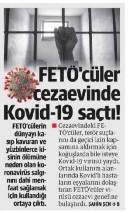 Bu tür “istihbarat haberleri” arasında en çok dikkatimi çeken, Yeni Şafak’ın “FETÖ’cüler cezaevinde Kovid0 saçtı” haberi oldu. Anlaşılması için spotunu aktarsam yeter sanırım: