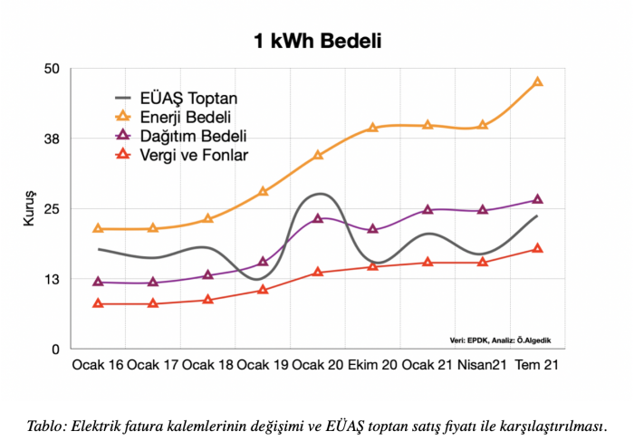 Bu ilk dalga zamlarının arkasında elektrikte özelleştirme, odun ve kömürde fosil ve ithalat bağımlılığı (1), petrolde ise ulaşımın özelleştirilmesi, fosil yakıt bağımlılığı vardı. Özelleştirmeyi neden olarak koymamızın çok basit bir gerekçesi var: O da Elektrik Üretim Anonim Şirketi (EÜAŞ). Yani kamunun elektrik fiyatları sabitken, özelleştirilmiş santral ve özel santrallere sürekli zam yapılması ve hatta dağıtım şirketlerine de zam verilmesi. Ağustos ayında kullandığımız aşağıdaki grafik kadar bunu temiz anlatan başka bir grafik yoktur herhalde. İncelemenizi öneririm.