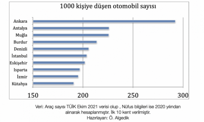 Ankara’da şu an 1000 kişiye 399 araç düşüyor. Bunun 292 tanesi otomobil. En yakın rakibine öyle bir fark atmış ki, ikinci sırada olan Antalya’da 1000 kişiden 226’sına araba düşerken İzmir’de bu sayı 195, İstanbul’da 203.