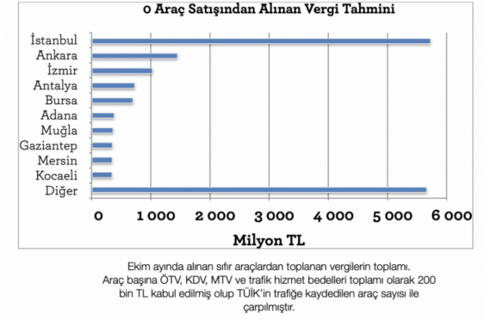 Bu hesaba göre Türkiye’de yeni alınan sıfır 85 bin 691 araç sayesinde devlet 17 milyar TL civarı STV toplamış; bunun 5,7 milyar TL’si İstanbul’dan, 1 milyar TL’si İzmir’den. CHP’li 7 büyükşehir belediyesi 10 milyar TL’den fazla STV toplayarak iktidarın en büyük arzusunu gerçekleştirmiş.