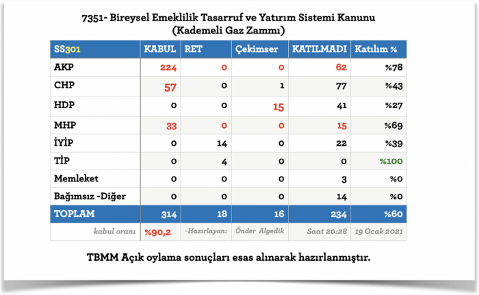 Bu durum AKP’yi çok mutlu etti. Kasalar boştu ve kademeli zamma karşı çıkacak muhalefet yoktu. Bu fırsatla kademeli gaz zammını içeren bireysel emeklilik kanununu 19 Ocak akşamı geçirdi. CHP yine kabul oyu verdi (57 kabul), HDP yine çekimser kaldı (15 çekimser). İYİP (14) ve TİP (4) ret verdiler. Ama sonuçta katılanların yüzde 90’ının KABUL oyu ile geçti.