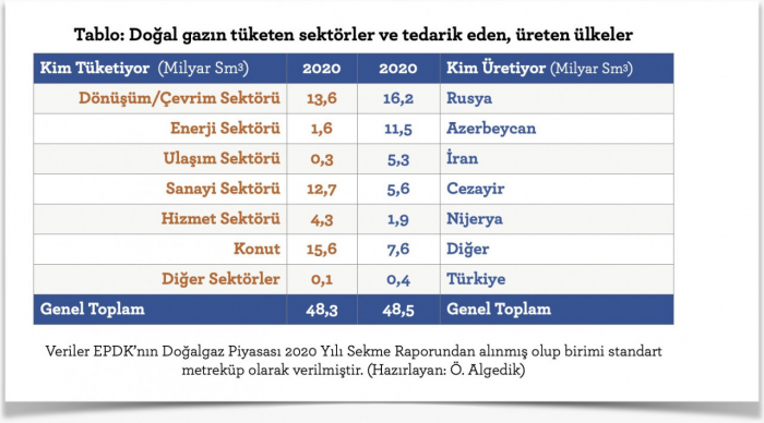 2020 yılında Türkiye 48,3 milyar sm³ gaz ithal etti. Bunun üçte birini binalarda, üçte birini sanayide ve kalan üçte birini de elektrik üretiminde kullandı. Bu gazın ithalatında birinci Rusya oldu. Onu Azerbaycan ve İran takip etti. Ayrıca borular dışında sıkıştırılmış olarak Cezayir ve Nijerya gibi ülkelerden gemilerle getirttik. EPDK’nın bu verilerini sizin için basitleştirdim ve tablo olarak hazır ettim.