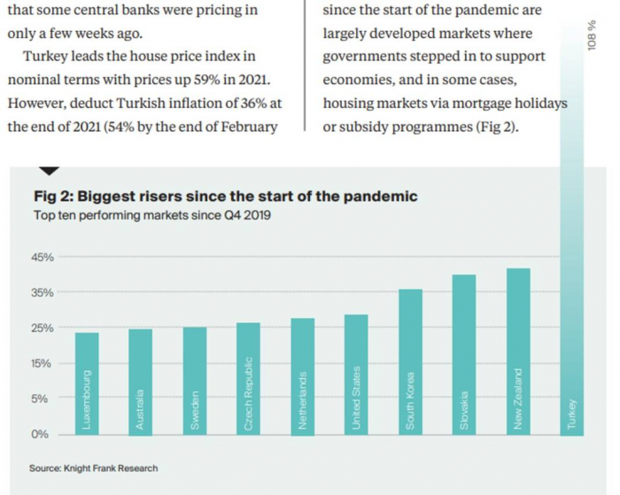 Londra merkezli emlak danışmanlığı şirketi Knight Frank, 2021 yılının son çeyreğinde konut fiyatlarının en çok arttığı ülkeleri sıraladı. Türkiye listenin ilk sırasında yer aldı. Raporda dünya çapında ev fiyatları 2021'de ortalama yüzde 10.3 oranında yükselirken Türkiye’de bu artışın yüzde 108 olduğu bilgisi verildi. Dünyada yüzde 10.3 bizde yüzde 108!