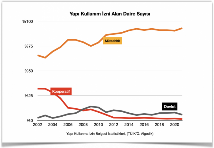 AKP'nin iktidara geldiği 2002’de Türkiye’de yapı kullanım izin belgesi alan üç daireden birini kooperatifler yapıyordu. Kooperatiflerin payı düştü, 2010’da yüzde 9’a, 2021’de ise bu yüzde 1’e indi. Dolayısıyla barınma meselesinde şirketlere köle olduk.