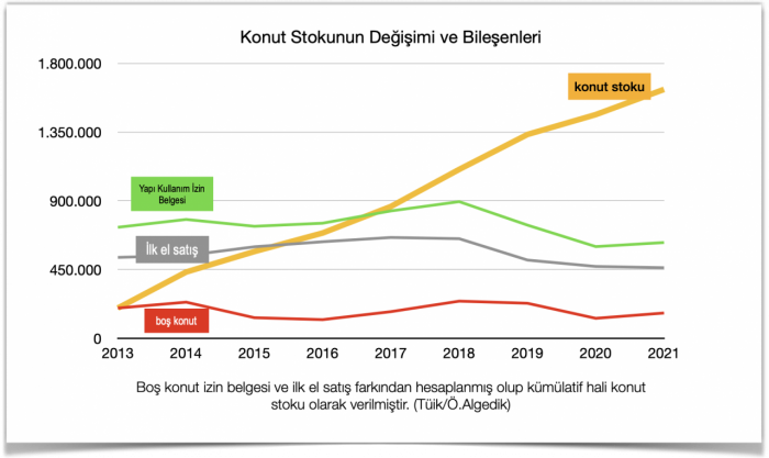 TÜİK her yıl yapı kullanım izin belgesi ve ilk el konut satışı sayısını verir. Bu ikisinin arasındaki fark bize konut stokunu verir. 2021 Temmuz’unda bu sayı 1,5 milyonu geçti. TÜİK’in 2021 verileri ile tamamlanınca konut stoku, yani boş ev sayısı 1 milyon 629 bine çıkıyor.