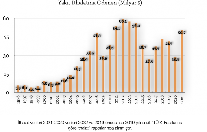 TÜİK Nisan ayında fasıllara göre ithalatı açıkladı. Açıklanan verilere göre Türkiye 2020’de 28,9 milyar doları enerji ithalatı için Rusya, Irak, S.Arabistan, Kolombiya gibi ülkelere vermişti. 2020 yılının enerji tüketimi ve seragazı emisyonunda rekor bir yıl olduğunu hatırlayalım. 2021 yılında ise faturamız 50,7 milyar dolara çıkmış. Böylece 2002-2021 döneminde fosil yakıt üreticilerine bu halkın cebinden alınarak ödenilen para 732,8 milyar dolar olmuş.