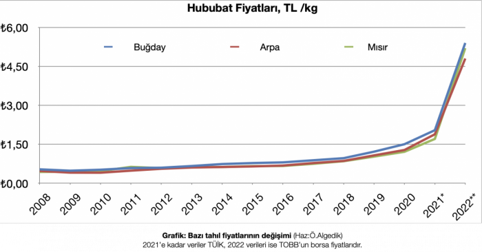 Önce bir grafik ile başlayalım. Bu grafik üç temel tahıl ürünü fiyatlarındaki değişim. Hokey sopası gibi 2020 sonrası sıçramış. 2021 yılı TÜİK tahminleri, 2022 verileri ise TOBB borsasının bu haftaki fiyatları. Bu grafiği elektrik fiyatları için de çizebiliriz.