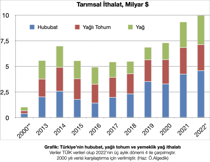 Biz ne yaptık? Daha çok imar, daha çok asfalt-beton, daha çok ithalat faturası ve daha çok sermaye transferi. Hemen onun da grafiğini verelim mi? Türkiye 2000 yılında hububat, yağlık tohum ve yemeklik yağ için ithalata bir milyar dolar veren bir ülke imiş. 2013 yılında bu rakam beş milyar doları geçmiş. 2021’de de 10 milyar dolara dayanmış. 2022’nin ilk üç ayı gibi olursa bu ithalata 10 milyar dolar vereceğiz.