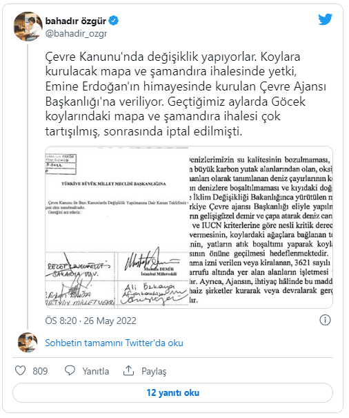 Bu 5 Haziran’ı anlamlı kılan başka şeyler de var. Meclis’e yeni bir kanun daha geldi. O da sessiz sedasız görüşülüyor. "Çevre Kanunu ile Bazı Kanunlarda Değişiklik Yapılmasına Dair Kanun Teklifi” adıyla çevre diyerek başlayan ve devamında 11 kanunu değiştiren teklif Cumhurbaşkanı’na, “hanımına” ve gayri menkul şirketlerine yetki, imtiyaz sağlıyor, istisnalar getiriyor. Atık su, atık bertaraf tesisi ve atık geri kazanım tesislerinin yapımının şirketlere devredilmesi, yani hasta garantili hastane, yolcu garantili köprüye çevrilmesi. Dert yeni bir sermaye transferi, ülkeyi batıran modeli buraya taşımak. Bunları geçen hafta yazmıştık.