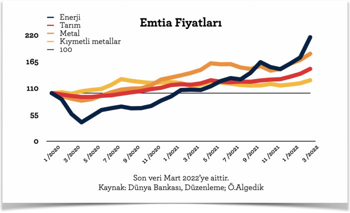 2020’de başlayan pandemi de taleplerin erteleneceği öngörüsü ile pandemi fırsatçılığı yapan şirketler 2021'de talebin artacağı öngörüsü ile hammadde, gıda ve enerji kalemlerinde fiyat yükselttiler. Bunun mekanizmasını ve enerji özelinde yoksulluğa etkisini Kasım 2021’de yazmıştık. Orada kullandığımız grafiğin güncelini de aşağıda bulabilirsiniz.