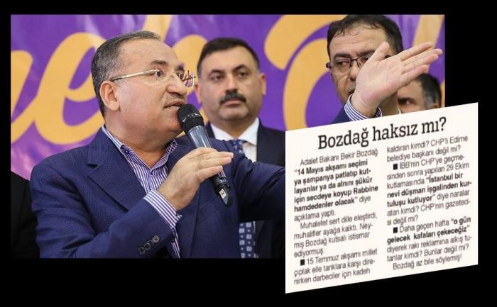 Ancak “tarafsızlık” konusunda bu görüşü dile getiren Selek’in, “az bile söylemiş” diyerek Bekir Bozdağ’ı savunması yadırgatıcı. Zira Bozdağ, o konuşmasıyla açıkça bu ülkenin insanları arasında ayrımcılık yaptı. AKP’nin kazanmasından mutlu olacakları “alnını secdeye koyanlar”, AKP’nin kaybetmesine sevinecekleri de “şampanya patlatanlar” olarak kategorize etti. Bir tarafı “dinine bağlı Müslümanlar” diye yüceltirken, öbür tarafı “içki içenler” olarak ötekileştirdi.