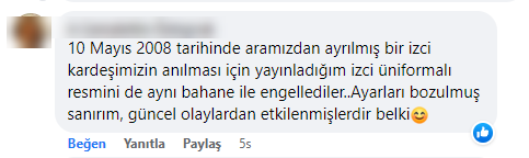 “10 Mayıs 2008 tarihinde aramızdan ayrılmış bir izci kardeşimizin anılması için yayınladığım izci üniformalı resmini de aynı bahane ile engellediler. Ayarları bozulmuş sanırım, güncel olaylardan etkilenmişlerdir belki”