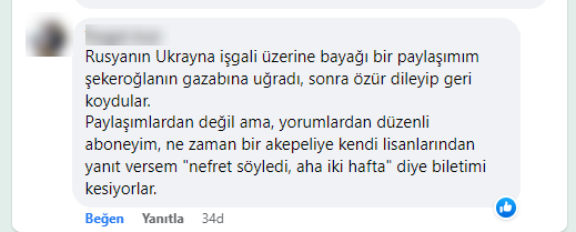 - “Rusya’nın Ukrayna işgali üzerine bayağı bir paylaşımım şekeroğlanın gazabına uğradı, sonra özür dileyip geri koydular. Paylaşımlardan değil ama, yorumlardan düzenli aboneyim, ne zaman bir akepeliye kendi lisanlarından yanıt versem "nefret söyledi, aha iki hafta" diye biletimi kesiyorlar.”