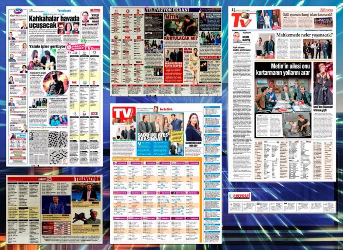 Evrensel: Medya sayfasında Halk TV, Artı TV, Tele 1, KRT TV, FOX, TRT, Show ve Kanal D’nin programlarından seçmeler küçük kutular halinde yayımlanıyor.