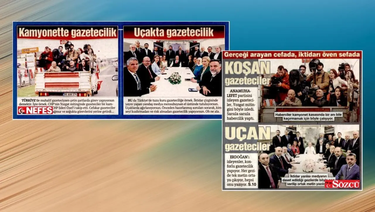 Yozgat’taki CHP mitingini kamyonet üzerinden izleyen gazetecileri, Cumhurbaşkanı Erdoğan’ı izleyenlerle kıyaslayan Nefes “Kamyonette gazetecilik/Uçakta gazetecilik”, Sözcü ise “Koşan gazeteciler, uçan gazeteciler” diye benzer şekilde haberleştirdi.