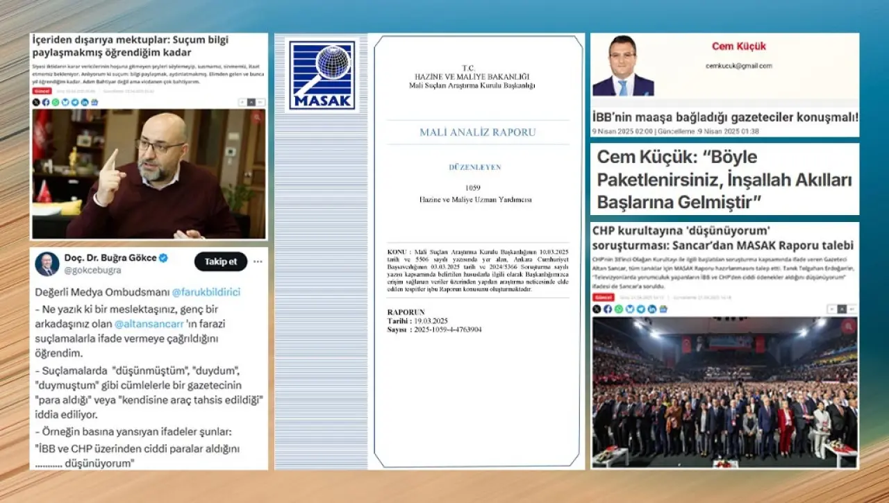 Oysa isimlerini sıraladığı gazetecilerin çoğuyla ilgili hiçbir somut veri yok. Halk TV’nin sahibi Cafer Mahiroğlu ile gazeteciler Altan Sancar, Şaban Sevinç ve İsmail Saymaz’ın isimlerinin de CHP Kurultayı ile ilgili MASAK raporunda nasıl geçtiğini belirtmiyor.