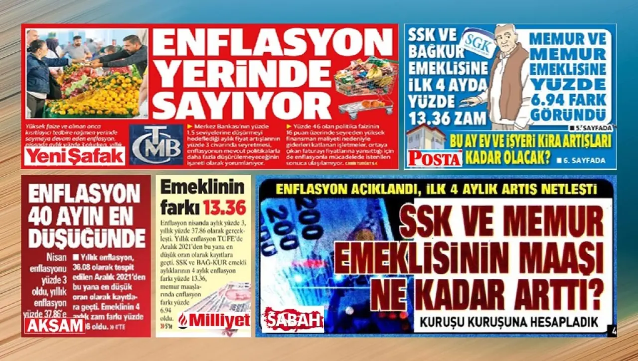 - Sabah, Milliyet, Posta gazeteleri, enflasyon oranı yerine “emeklilerin alacağı zam farkı”nı ilk sayfaya taşıdı; Akşam ve Türkiye de yıllık enflasyonun düştüğünü vurguladı; Yeni Şafak ise “Enflasyon yerinde sayıyor” diyerek iktidar yanlısı öbür gazetelerden ayrıştı.
