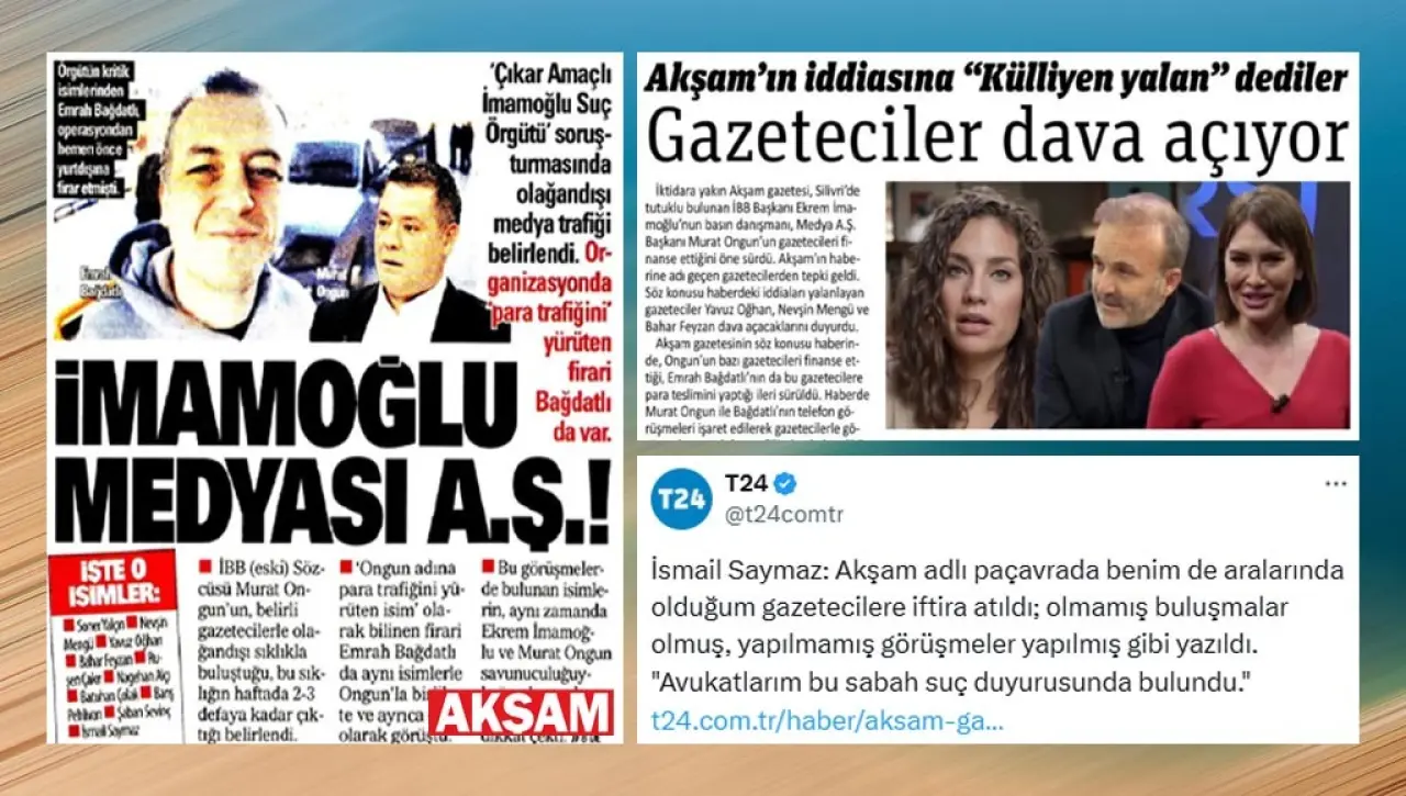 Akşam gazetesinin, “İmamoğlu Medyası A.Ş.” manşetinde, bazı muhalif gazetecilerin, İBB Basın Danışmanı Murat Ongun ve yardımcısı Emrah Bağdatlı ile sık sık buluştukları ve para aldıkları öne sürülüyordu.