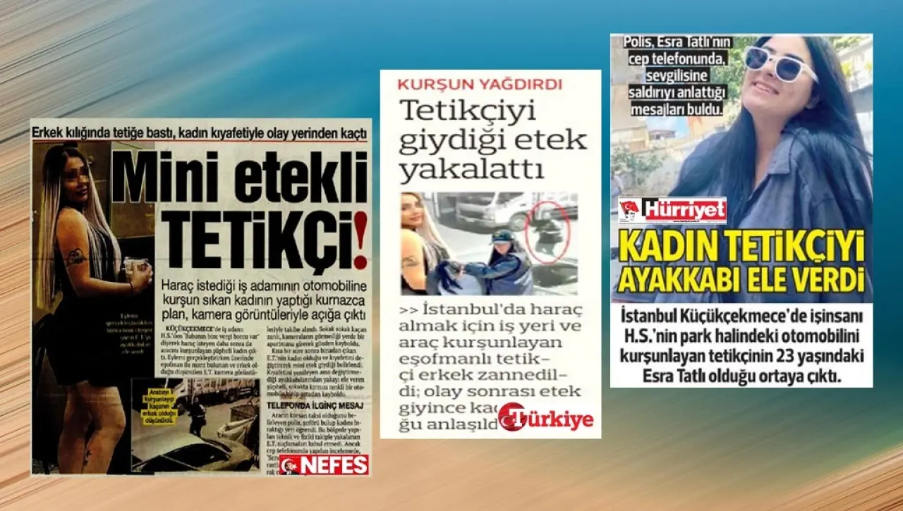 Fakat dijital medya “Mini etekli tetikçi” diye süsledi bu olayı. Sonra da Takvim ve Ekol TV, “Eşofmanla girdi mini etekle çıktı”, Milliyet, “Mini etek giyince kadın olduğu anlaşıldı”, Halk TV “Kurşun yağdırıp mini etekle kaçtı”, Nefes “Mini etekli tetikçi” haberleri yayımladı.