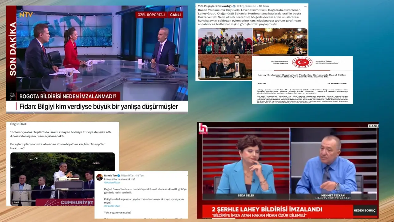 Tezkan, “Fidan haklı” değerlendirmesini yaptığında ise takvimler 30 Temmuz’u gösteriyordu. Anlaşılan Tezkan, süreci yakından izlememiş; tarihlere dikkat etmemişti. Sadece Fidan’ın sözlerine ve bakanlığın sanki “Bogota Bildirisi’nin muhalefet şerhi ile imzalanması baştan beri planlanmış” gibi sunmasına bakarak değerlendirme yapıyordu. Zaten programda Özel-Fidan tartışmasına dair hazırlanan VTR de eksik ve yanlıştı.