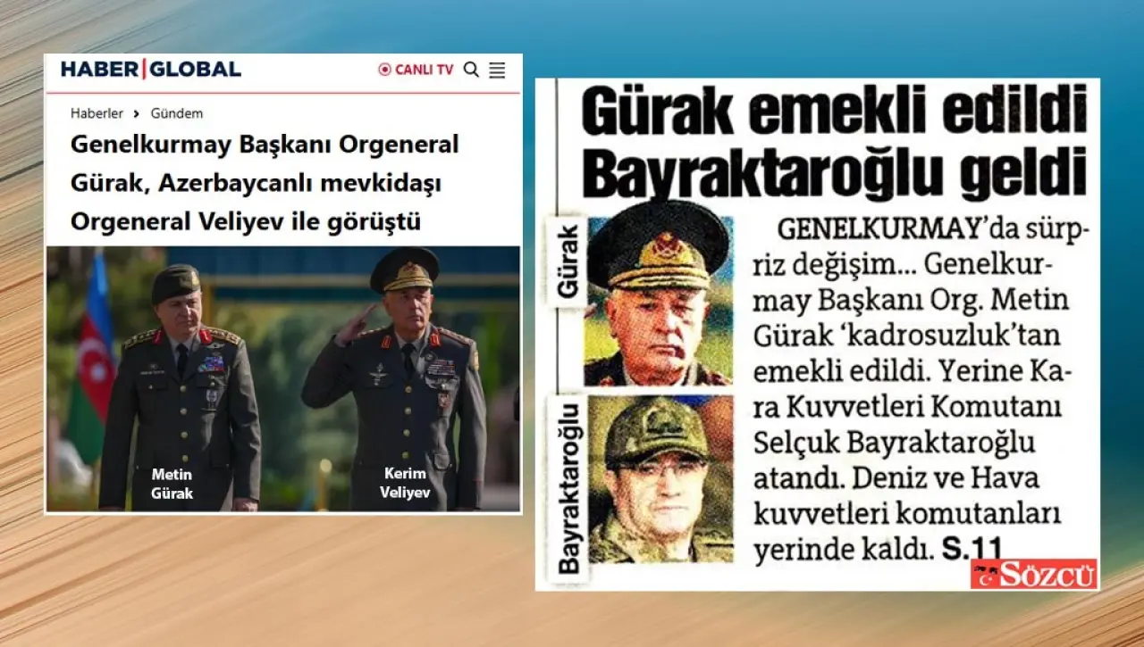 • Sözcü, “Gürak emekli edildi, Bayraktaroğlu geldi” haberinde Orgeneral Metin Gürak ile bir süre önce Ankara’yı ziyaret eden Azerbaycan Genelkurmay Başkanı Orgeneral Kerim Veliyev’i karıştırdı; Gürak yerine Veliyev’in fotoğrafını kullandı.