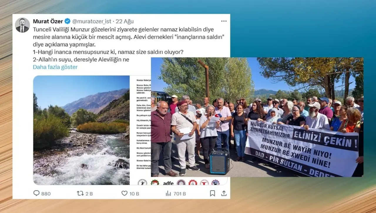 Tunceli Valiliği’nin, Aleviler’in kutsal kabul ettiği “Munzur gözeleri”nde mescit açması, Alevi sivil toplum örgütlerinin tepkilerine neden oldu. Akşam gazetesi yazarı Murat Özer de Alevi kuruluşlarının protesto metnini alıp sosyal medyada paylaştı; altına da şöyle yazdı: