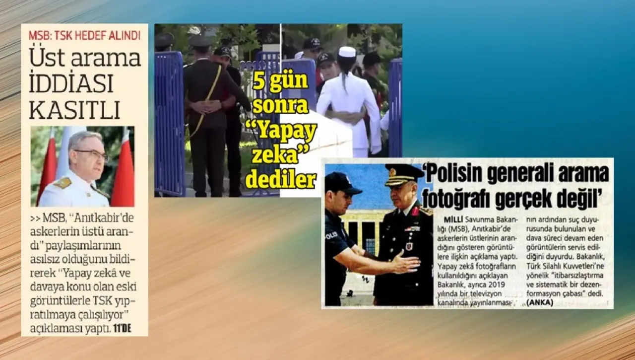 MSB, görüntüyü değil, Anıtkabir avlusunda bir polisin bir generali araması fotoğrafını yalanlıyor. Maalesef yapay zekâ ürünü olduğu besbelli bu fotoğrafı bazı yerel siteler kullandı. Atatürkçü Düşünce Derneği Başkanı Hüsnü Bozkurt da paylaştı, ama sonra sildi.