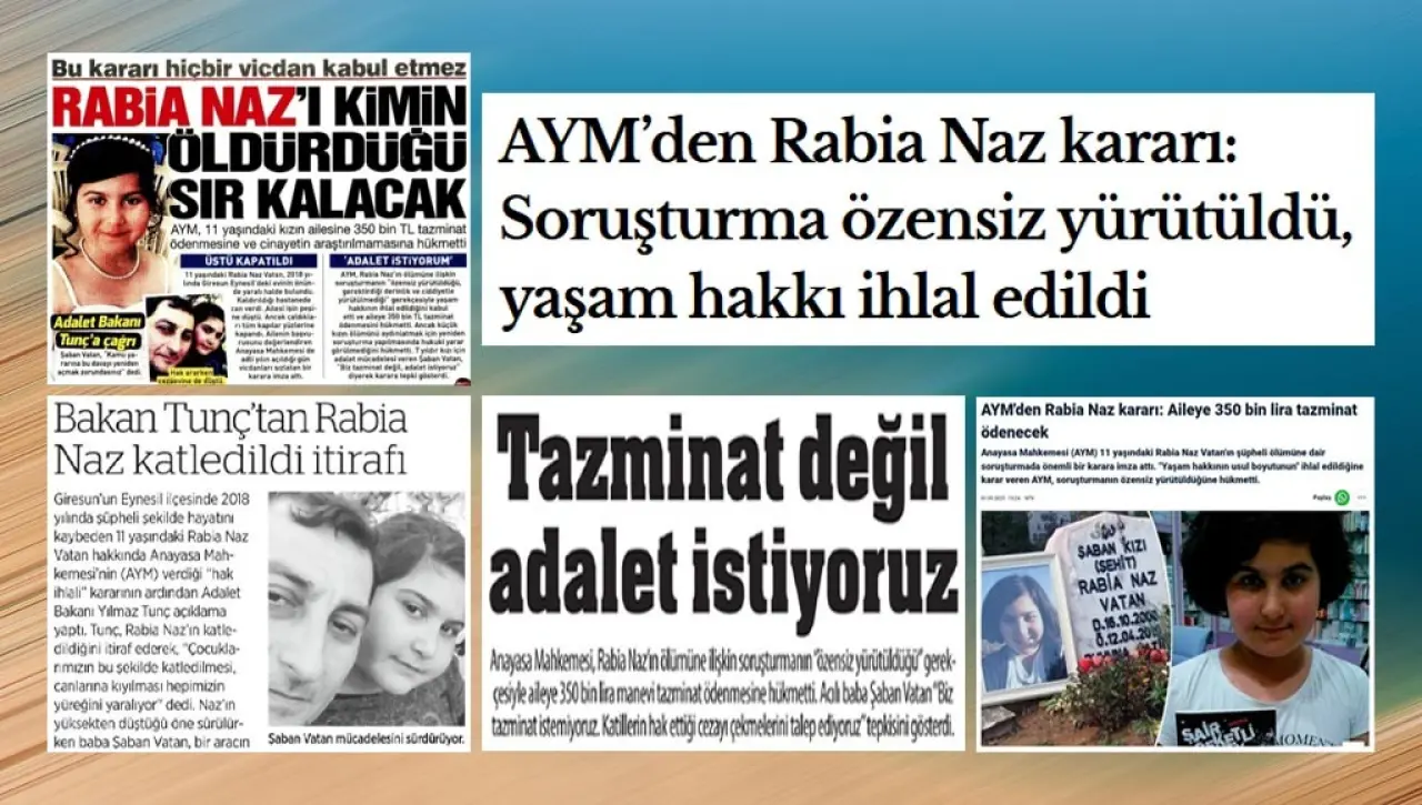 Zira Anayasa Mahkemesi hem Rabia Naz’ın ölümüyle ilgili soruşturmanın özensiz, ciddiyetsiz yürütüldüğünü ve yaşam hakkının ihlal edildiğini saptıyor; hem de “yeniden soruşturma yapılmasında hukuki yarar” görmüyor; 350 bin lira tazminata hükmediyor sadece. Anayasa Mahkemesi de bu ölümün sorumlularının ortaya çıkarılmasını istemiyor, tam tersine dosyayı ilelebet arşive havale ediyor.