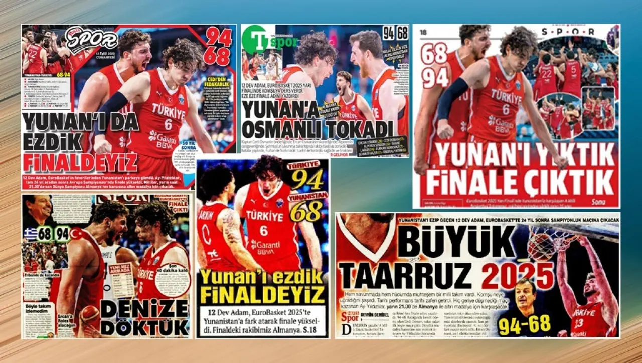 Maalesef basketbol milli takımının Yunanistan takımını yenmesinden sonra da gazetecilik sınırları hayli aşıldı. “Yunan’ı ezdik finaldeyiz (Posta), “Büyük taarruz 2025 (Nefes), “Denize döktük” (Sözcü) “Yunan’a Osmanlı tokadı” (Türkiye), “Yunan’ı yıktık, finale çıktık” (Yeni Şafak) başlıkları sevinci değil düşmanlığı, dahası nefret söylemini yansıtıyordu.