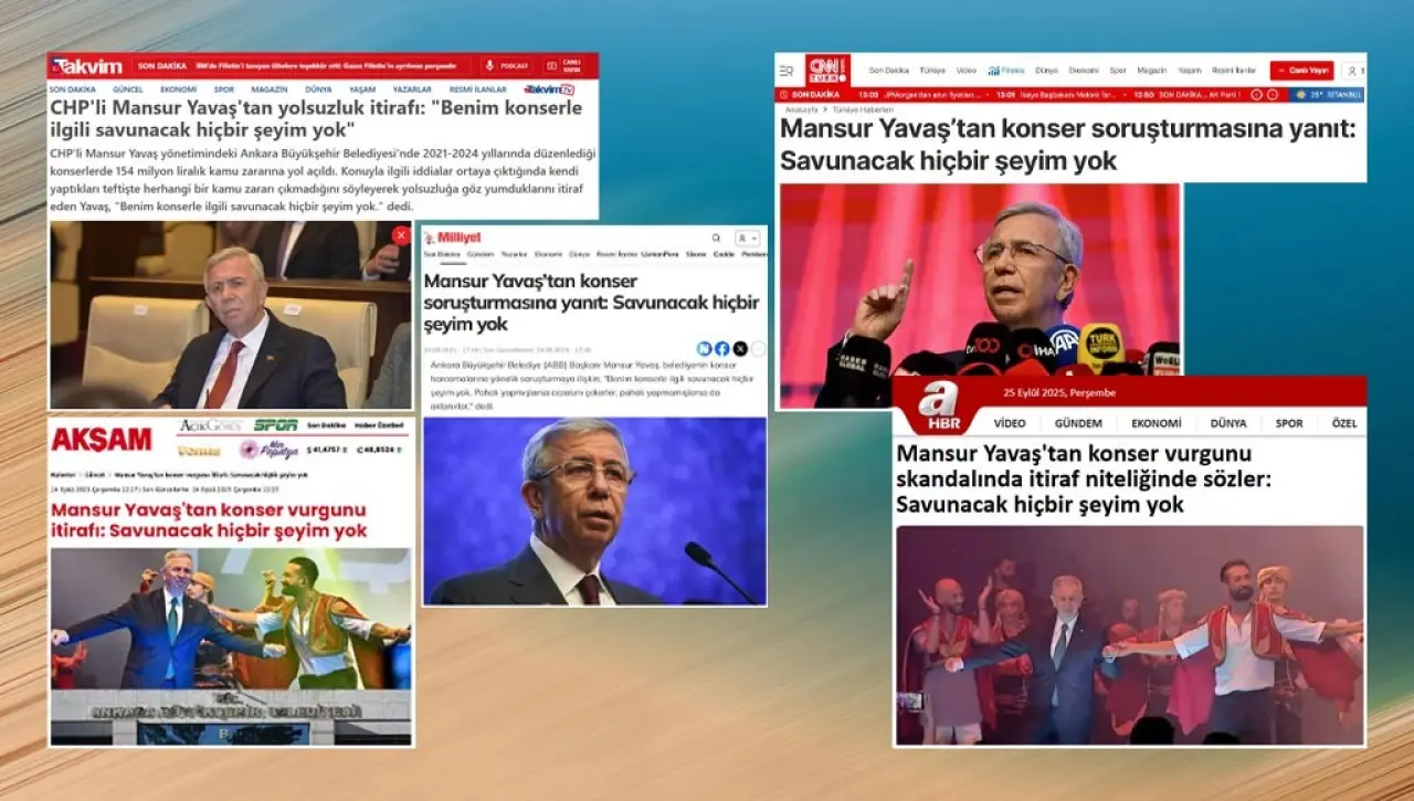 Ankara Büyükşehir Belediye Başkanı Mansur Yavaş, konserler nedeniyle başlatılan operasyon sonrasında düzenlediği basın toplantısında “Konserle ilgili benim savunacak hiçbir şeyim yok, pahalı yapmışlarsa cezasını çekerler ama yapmamışlarsa aklanırlar” dedi. Akşam, A Haber, Sabah ve Takvim’in haber siteleri ise Yavaş’ın cümlesinin ilk yarısını alarak benzer başlıklar attılar: