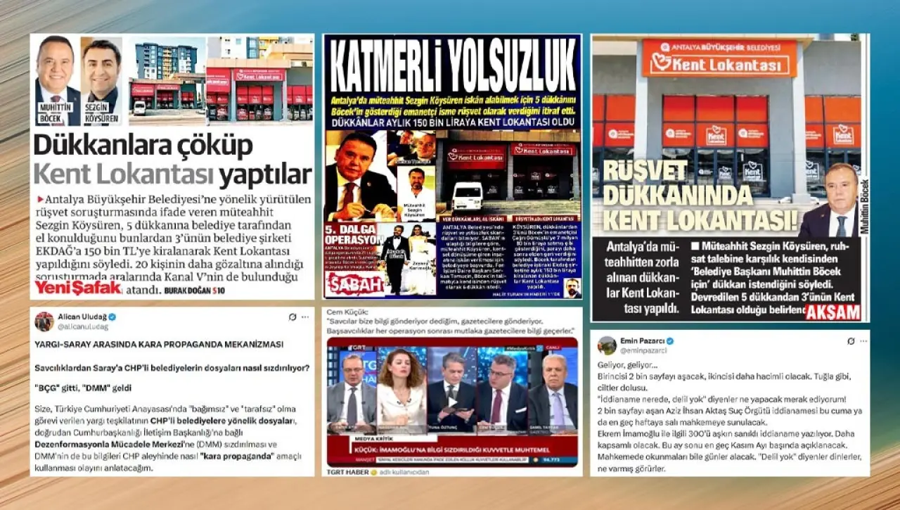 Bir örnek vereyim; 11 Eylül’de, Antalya Büyükşehir Belediyesi’ne yönelik soruşturmada gözaltına alınan müteahhit Sezgin Köysüren’in, “belediyenin beş dükkânına el koyduğu, üçünün Kent Lokantası yapıldığı” yolundaki ifadesi, Akşam’da “Rüşvet dükkânında Kent Lokantası”, Sabah’ta, “Katmerli yolsuzluk”, Yeni Şafak’ta ise “Dükkânlara çöküp Kent Lokantası yaptılar” başlıklarıyla yayımlandı. Sabah’ın haberinde Haber Müdürü Halit Turan’ın, Yeni Şafak’ın haberinde Burak Doğan’ın imzası yer alıyordu; ikisi de İstanbul’da görev yapıyor!