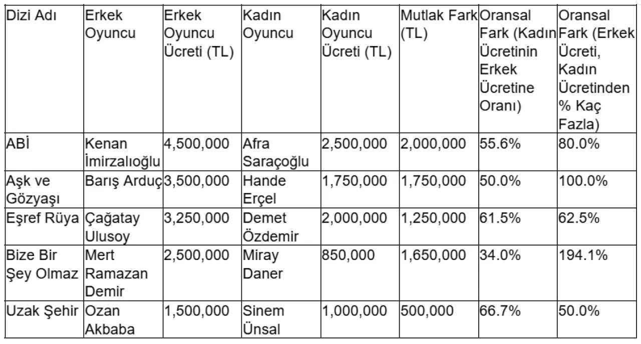 Rakamlar, Türkiye dizi sektöründeki cinsiyete dayalı ücret eşitsizliğinin boyutunu bir çırpıda yüzümüze vuracak şekildeydi: