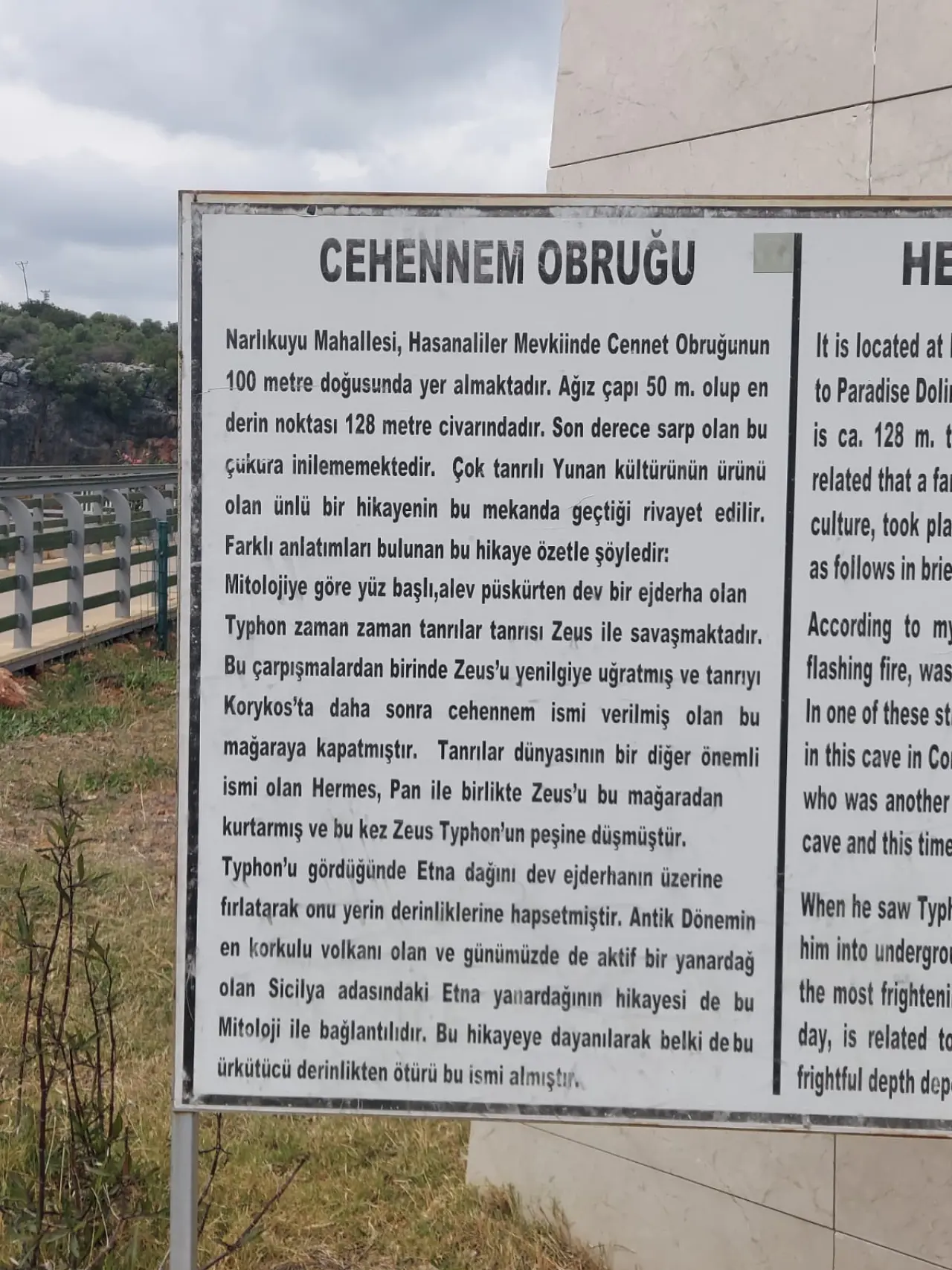 Cehennem belki yüz elli metre derinliğinde tepeler arasında bir yarık. Buraya inmek zor ama üstüne zemini cam olan bir köprü yapmışlar ki herkes geçemiyor. Ben kesinlikle denemedim ama yarı yolda yere yapışan insanlar ,yardım alarak geri gelenler varmış.
