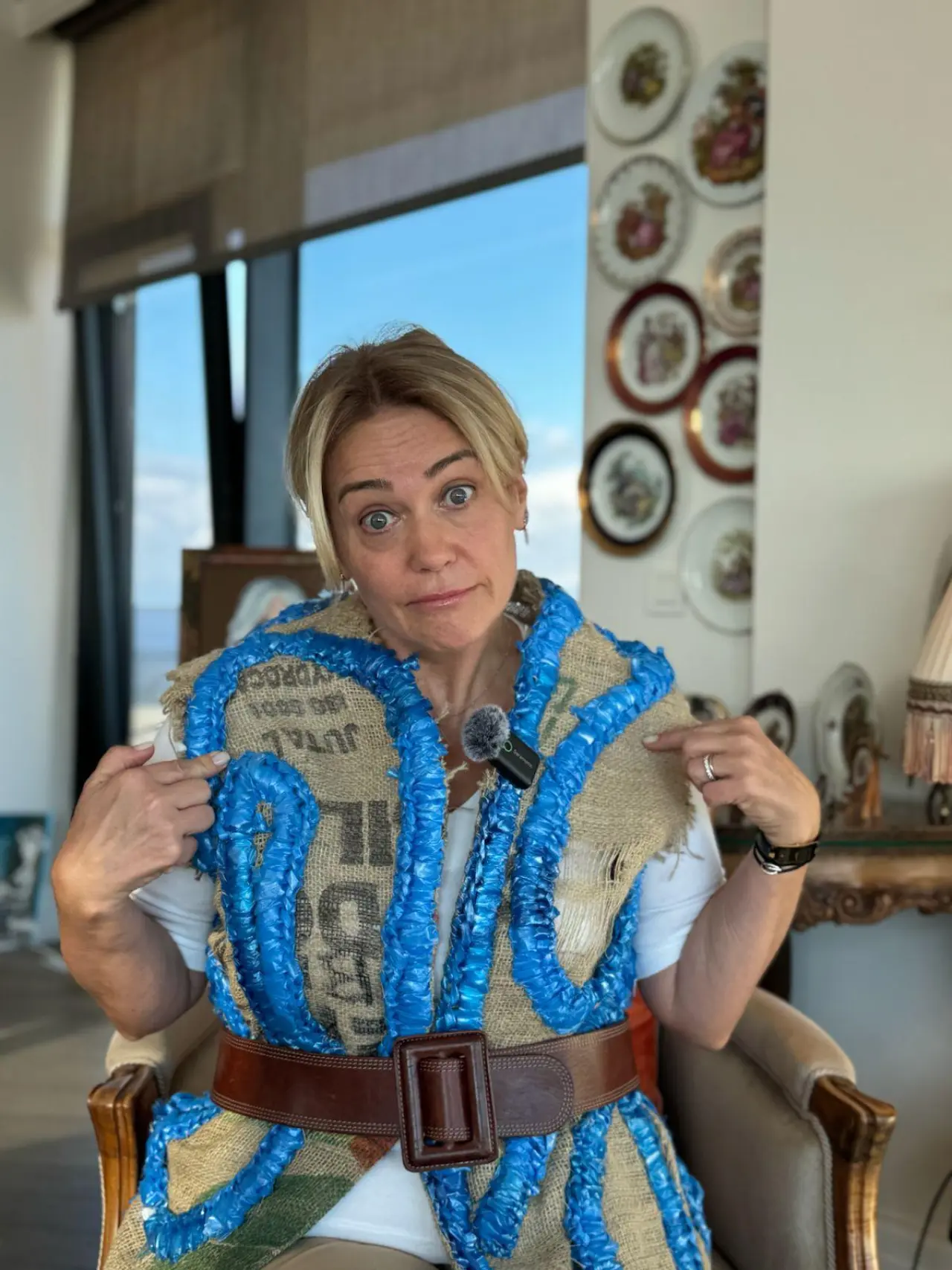 Bu bakış açısı, Elif Hanım’ın atıklardan ürettiği kıyafetlerde somutlaşıyor. Kahve çuvallarından yelekler, plastik poşetlerden ve kapaklardan yapılan giyilebilir parçalar… Bunlar birer “kıyafet” değil; farkındalık yaratmak amacıyla giyilebilir ama günlük hayata ait değiller. Benim için durum farklı, Elif Hanım’ın kahve çuvallarından yaptığı yeleği bir güzel giyiyorum.