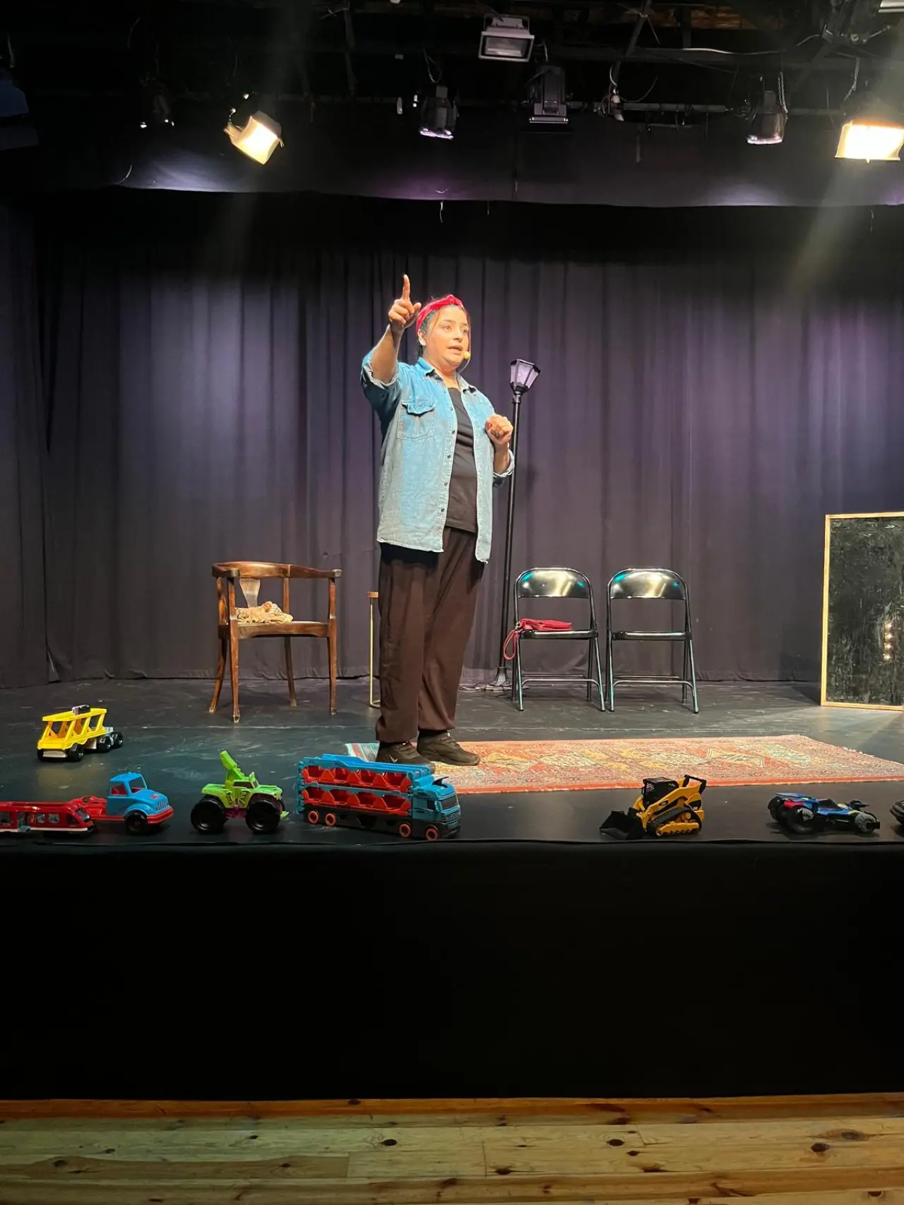 Eşini, oyun sırasında ise yönetmenini de eleştiriyor. İşte o arada spotlar açılıp, kapanıyor.
