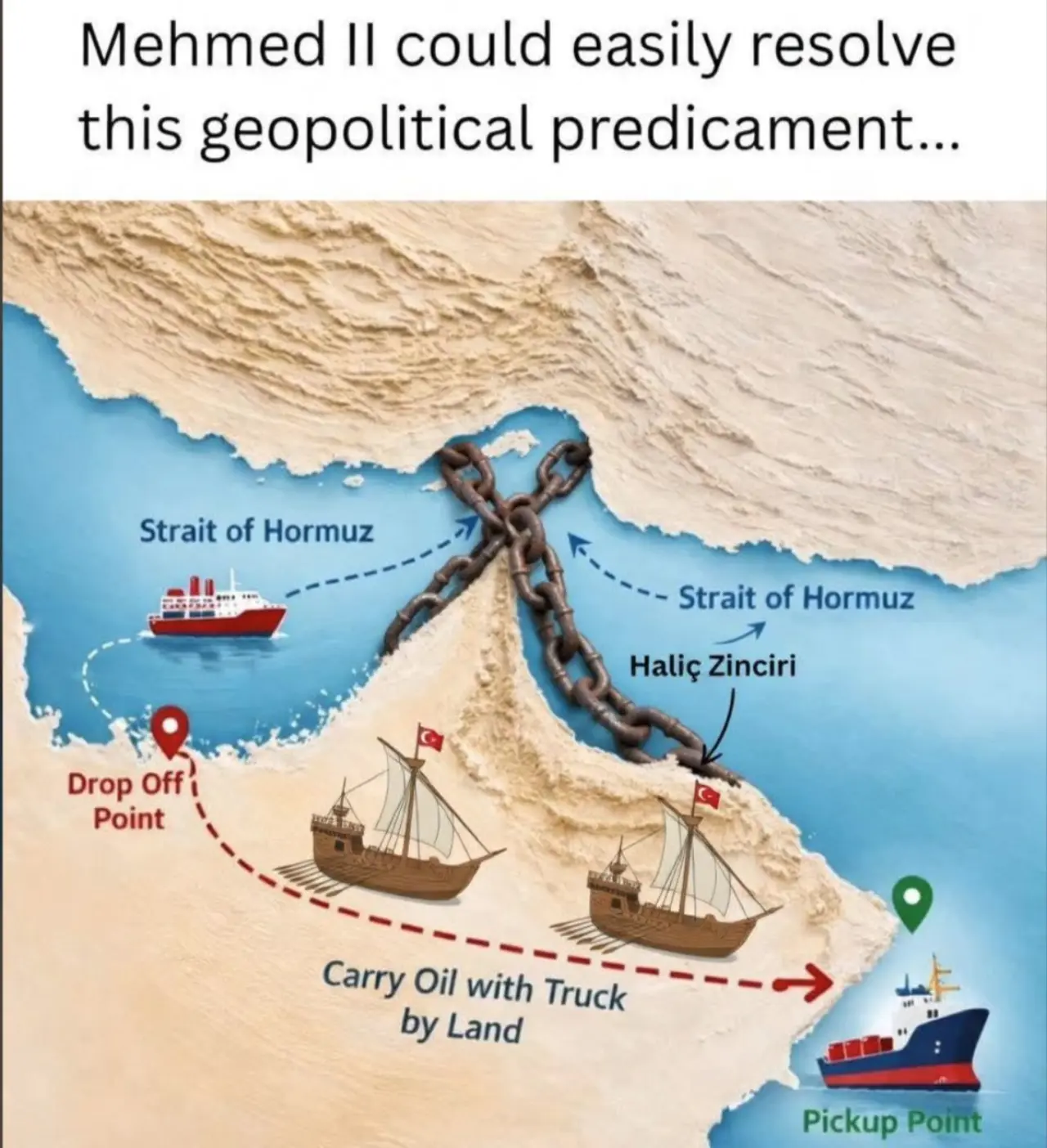 Bu güne kadar üzerinde düşünülmüş bir maliyet ve fizibilite hesabı olmayan “Kanal Hürmüz”, kâğıt üzerinde “Kuru kanal” veya Bölgesel Kalkınma Projesine yeni bir “bağlantı” imkânı sağlayabilir. Suudi Arabistan ve Katar proje ayrıntısıyla yatırım sertifikası da çıkarabilir. Ama finansman sağlansa bile projenin savaş sürerken başlaması zaten söz konusu olamaz. Mizah olarak elden ele dolaşan reddit[2] görseli, Fatih Sultan Mehmet’in çılgın projesini jeopolitik bir açmaza çözüm olarak önerince şakası bile gurur veriyor. Ancak eğer böyle bir proje akla gelirse, eminim çok daha çılgın ve çevre düşmanı “Kanal İstanbul”, “Kanal Hürmüz” için örnek olarak alınır. . Oysa “Kanal İstanbul”, asla “Kanal Hürmüz” için emsal olmamalı. Alternatif projeler değerlendirilirken ABD nin olmadığı bir ortamda bölge barışına hangi projelerin daha iyi hizmet edeceği iyi düşünülmeli.