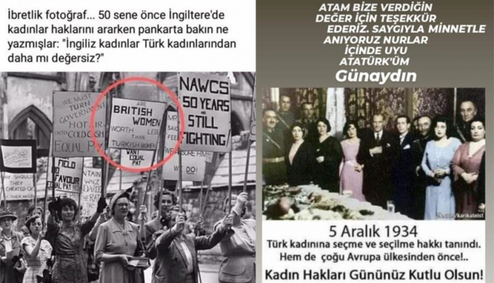 5 Aralık ile ilgili fotoğrafları görünce Atatürk’ün ne büyük olduğunu bir kez daha anladım. Türkiye’de Avrupa ve Amerika’dan önce Kadınlara seçme ve seçilme hakları verilmişti. Kadınlar o ülkelerden önce erkeklerle aynı işlerde çalışabiliyorlardı. Hatta fotoğrafta göreceğiniz gibi İngiliz kadınlar Türk kadınlar bizden üstün mü diye soruyorlar.