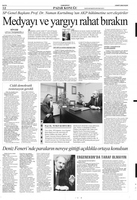 SP Genel Başkanı Prof. Dr. Numan Kurtulmuş’la İstanbul’daki bürosunda konuşuyoruz. Kurtulmuş sözlerini özenle seçip çok dikkatli bir üslup kullanarak AKP’ye ağır eleştiriler getiriyor. Medya üzerinde kurduğu baskıları kınıyor. Ancak medyanın da siyaseti kontrol etmekten vazgeçmesi gerektiğini söylüyor. Başbakan Erdoğan’ın sert çatışmacı konuşma tarzını “Soğuk Savaş dönemi üslubu” olarak nitelendiriyor. SP’yi yeniden çok geniş kitlelerin desteklemeye başladığına dikkat çekiyor. CHP’yi, AKP’nin yüzde 26’lara düşmüş oyunu, yaptığı yanlışlar yüzünden yüzde 47’ye çıkartmakla suçluyor. Anadolu’nun pek çok iline gittiğini, bu illerde AKP’li belediye başkanlarının eski heyecanlarını kaybetmeleri nedeniyle seçmenin desteğini kaybettiklerine işaret ediyor.