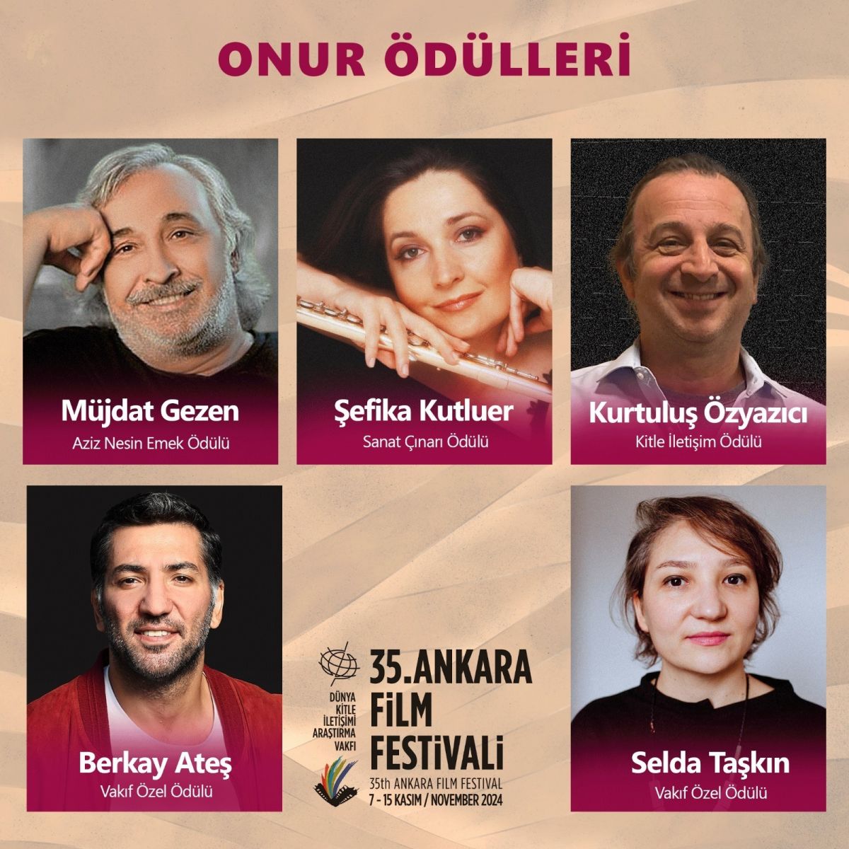 35. Ankara Film Festivali’nin onur ödüllerinin bu yıl, Müjdat Gezen, Şefika Kutluer ve Kurtuluş Özyazıcı’ya verileceği açıklandı. 35. Ankara Film Festivali’nde bu yıl üçüncü kez verilecek olan “Vakıf Özel Ödülü” ise reklam, film ve animasyon projelerinde yönetmen, yapımcı ve kurgucu olarak yer alan Selda Taşkın ile çeşitli tiyatro oyunları ve sinema filmlerinde yer alan başarılı oyuncu Berkay Ateş’in olacak.