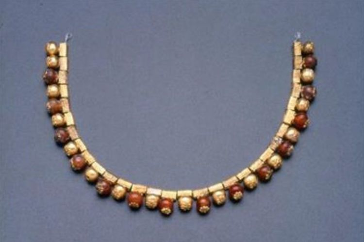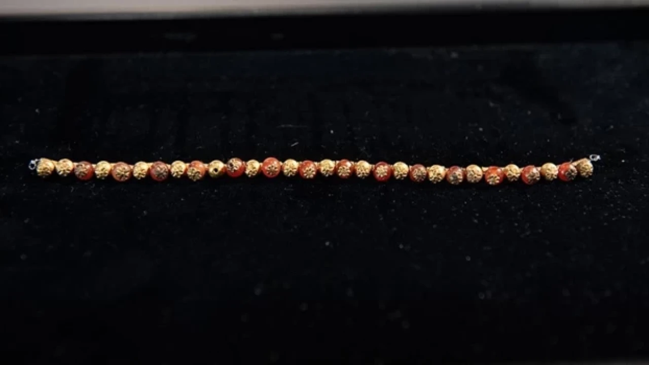 New York Kültür ve Tanıtma Ataşesi Hilal Demirel, AA muhabirine yaptığı açıklamada, kolyenin yaklaşık 20 santimetre uzunluğunda, altın ve karnelyan taşlarından yapılmış nar şeklinde boncuklardan oluştuğu bilgisini paylaştı.