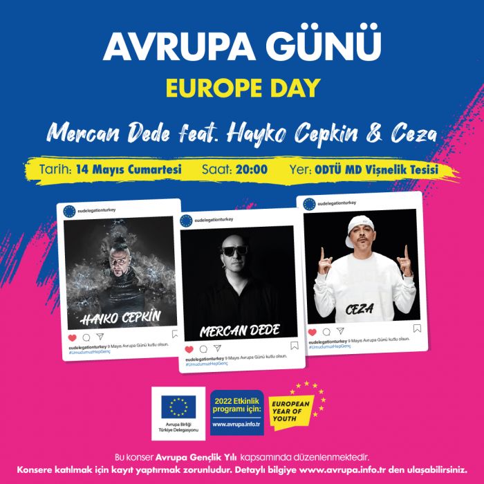 Avrupa Günü kapsamında mayıs ayı boyunca devam edecek etkinliklerde Mercan Dede, Hayko Cepkin ve Ceza’nın gençlik konseri heyecanla beklenenler arasında yer alıyor. Üç büyük sanatçı Avrupa Günü etkinlikleri kapsamında 14 Mayıs Cumartesi günü Ankara’da ODTÜ Mezunları Derneği Vişnelik Tesisleri’nde gerçekleştirilecek konserde ilk kez aynı sahneyi paylaşarak gençlerle buluşacak. Ücretsiz gerçekleşecek konsere katılmak isteyenler https://bit.ly/381Gnov adresinden kayıt yaptırabilecek.