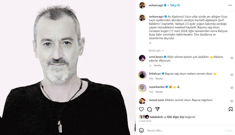 Çağrı, açıklamasında, “Acı kaybımız… Uzun yıllar içinde yer aldığım Grup Laçin üyelerinden akordeon sanatçısı kıymetli ağabeyim Şerif Baldemir’i kaybettik. Yaklaşık 2.5 aydır yoğun bakımda sürdüğü yaşam mücadelesini maalesef kaybetti. Başımız sağ olsun. Cenazesi bugün (17 Mart 2024) öğle namazından sonra Balçova Eyüp Sabri Camii’nden kaldırılacaktır. Tüm dostlarına ve sevenlerine duyurulur” ifadelerini kullandı.