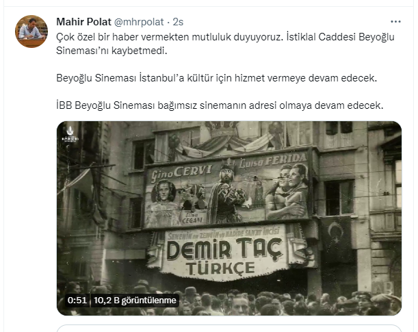 "Çok özel bir haber vermekten mutluluk duyuyoruz. İstiklal Caddesi Beyoğlu Sineması'nı kaybetmedi. Beyoğlu Sineması İstanbul'a kültür için hizmet vermeye devam edecek. İBB Beyoğlu Sineması bağımsız sinemanın adresi olmaya devam edecek."
