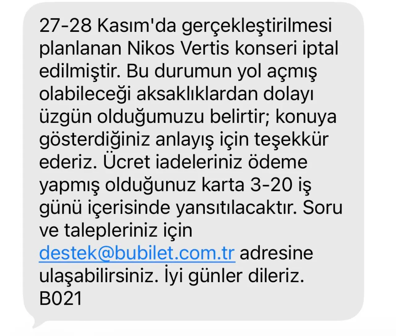 Nikos Vertis’i canlı dinlemek için planlarını yapan, belki de şehir dışından gelecek olan yüzlerce kişi, şimdi "efsanevi bir performans" yerine 3 ila 20 iş günü arasında değişen soğuk bir ücret iadesi sürecini beklemek zorunda kalacak.