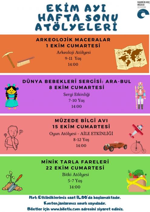 Rahmi M. Koç Müzesi’nin sanat-bilim atölyeleri ekim ayı boyunca devam ediyor. Çocukların hedef ve davranışlarına uygun olarak hazırlanan hafta sonu eğitim atölyeleri, müze eğitmenlerinin anlatımıyla gerçekleştiriliyor. Atölyeler süresince müzenin ilgili bölümleri geziliyor, ardından çocuklar gördüklerini kendi hayal dünyalarına göre tasarlıyor, eğlencenin tadına varıyor. Ekim ayı programında çocukların yanı sıra yetişkinleri de ‘Aile Etkinliği’nde farklı ve eğlenceli bir deneyim bekliyor.