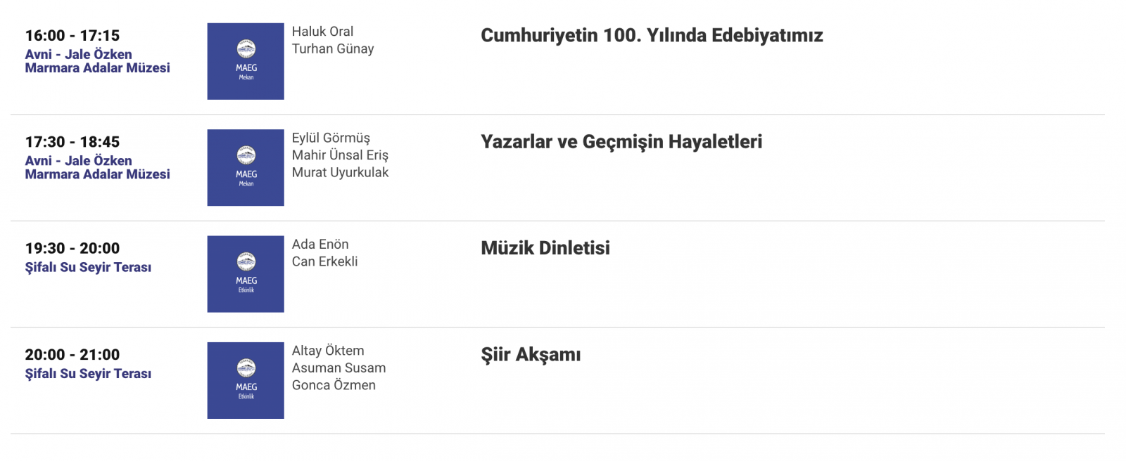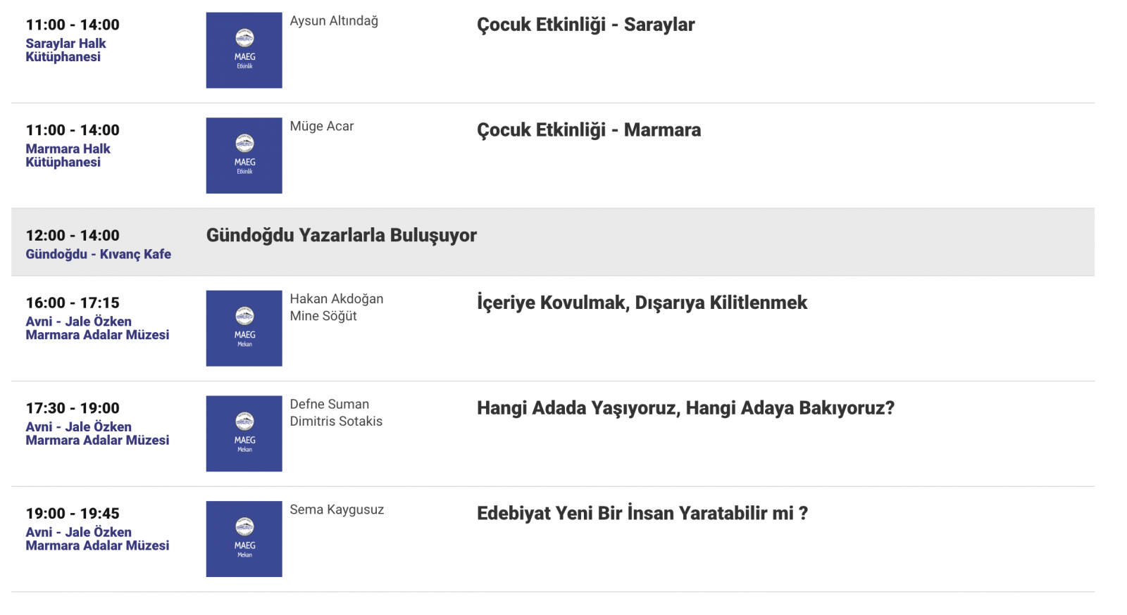 Yazarlar Ayfer Tunç, Defne Suman, Dimitris Sotakis, Hakan Akdoğan, Haluk Oral, Ioannis Papachristou, Mahir Ünsal Eriş, Mehmet Akif Yıldırım, Mine Söğüt, Murat Uyurkulak, Mustafa Çevikdoğan, Sema Kaygusuz, Turhan Günay’ın çeşitli konulardaki konuşmalarının moderatörlüğünü Cem Erciyes, Eylül Görmüş ve Oya Baydar yapacak.