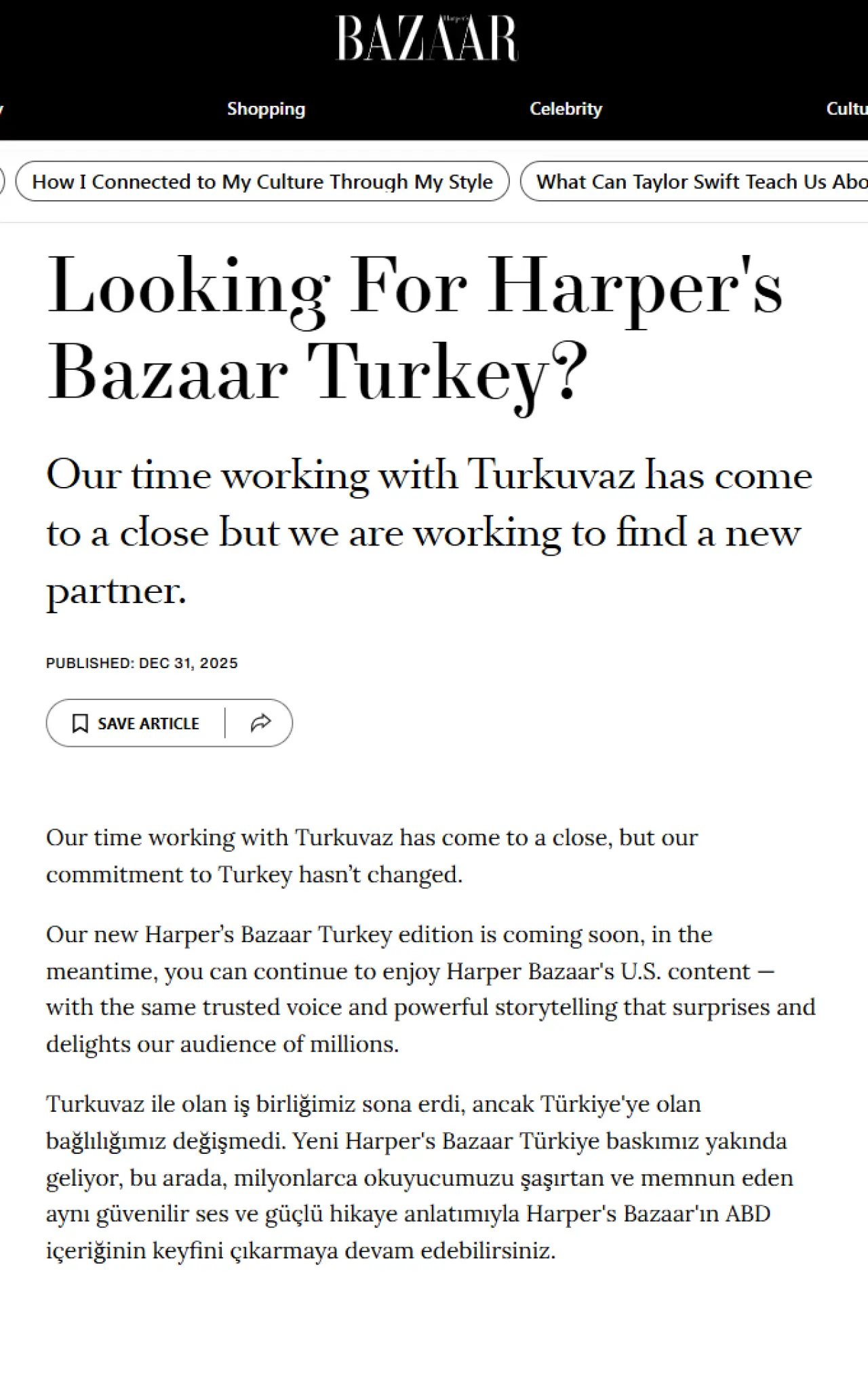 "Turkuvaz ile olan iş birliğimiz sona erdi, ancak Türkiye'ye olan bağlılığımız değişmedi. Yeni Harper's Bazaar Türkiye baskımız yakında geliyor. Bu arada, milyonlarca okuyucumuzu şaşırtan ve memnun eden aynı güvenilir ses ve güçlü hikaye anlatımıyla Harper's Bazaar'ın ABD içeriğinin keyfini çıkarmaya devam edebilirsiniz."