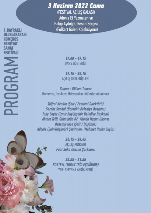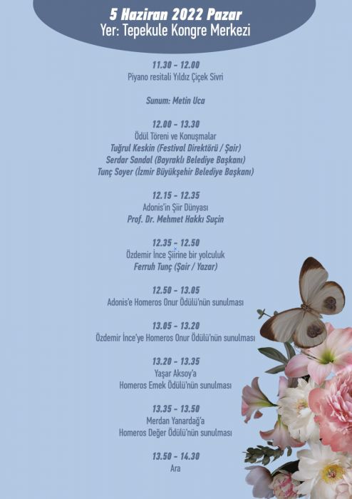 3-5 Haziran tarihinde Tepekule Kongre Merkezi’nde düzenlenecek festivalin onur konukları, iki kez Nobel Edebiyat Ödülü’ne aday gösterilen dünyaca tanınan Şair Adonis ve Türk Edebiyatı’nın duayenlerinden Özdemir İnce olacak. İki isme Homeros Onur Ödülü verilecek. Festivale yurtdışından şairler Raguel Lanseros, Manahel Alsahoui, Claudio Pozzani, Christos Koukis, Sylvestere Clancier de katılacak. Ülkemizden ise; Ahmet Telli, Yaşar Aksoy, Feyza Hepçilingirler, Nihat Behram ile birçok şair, gazeteci ve akademisyen yer alacak. Folkart Galeri’nin koleksiyonuna ait Adonis El Yazmaları ve Habib Aydoğdu Resim Sergisi de ziyarete açılacak.