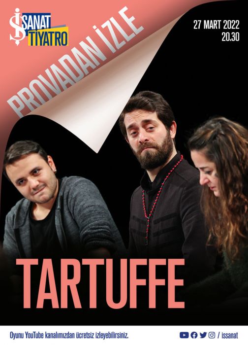 Yiğit Sertdemir’in yönetmenliğini üstlendiği oyunda, Tartuffe’ü Murat Kapu canlandırıyor. Ayşe Demirel, Yiğit Sertdemir, Sinem Öcalır, Meriç Rakalar, Ceyda Akel, İbrahim Arıcı, Tuğra Can Bıçak, Gülhan Kadim, Ayşegül Uraz ve İlayda Ulcaylı’nın rol aldığı Provadan İzle serisinin yeni oyunu Tartuffe, ilk gösterim tarihinden itibaren İş Sanat’ın YouTube kanalında ücretsiz izlenebilir.